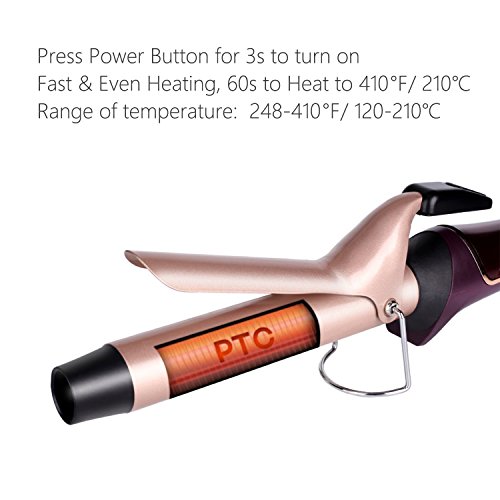 Fast Heating Up to 410°F in 60s: 3 seconds to start the curler, the heated iron will heat up to 410°F in 60s. The ceramic tourmaline ensures even heating. High efficiency to curl hair. Get ready easily as a breeze before going out. Range of heating: 250-410°F