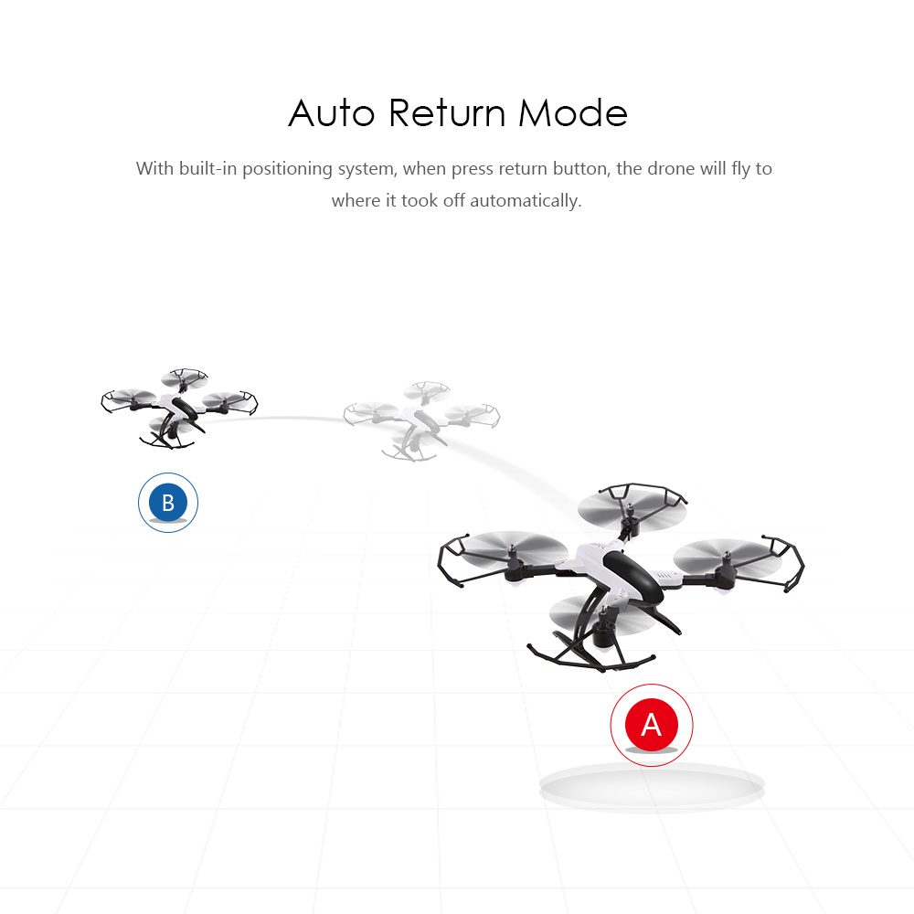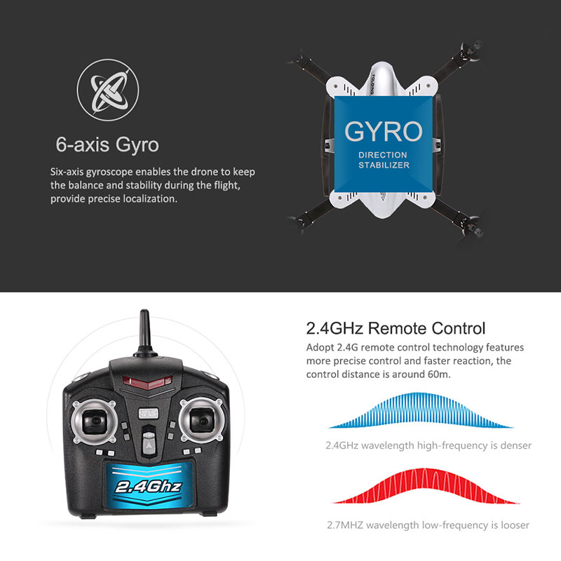 This drone adopts the favorable folding design, which suited to play indoor or outdoor. Equipped with 6-axis gyro stabilizer to ensure precise localization in the air, especially for 3D flips, the drone can give us a stunt aerial show.And it has the function of auto return, easily find the way home. Besides, specially-made plastic fuselage provides good toughness and high shock resistance.