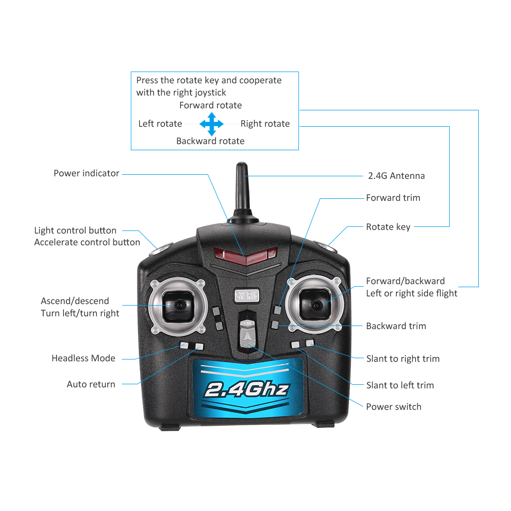 Functions: Ascent/descend, turn left/right, forward/backward, left/right side flight, 360° 3D eversion, auto return, headless mode, LED light.