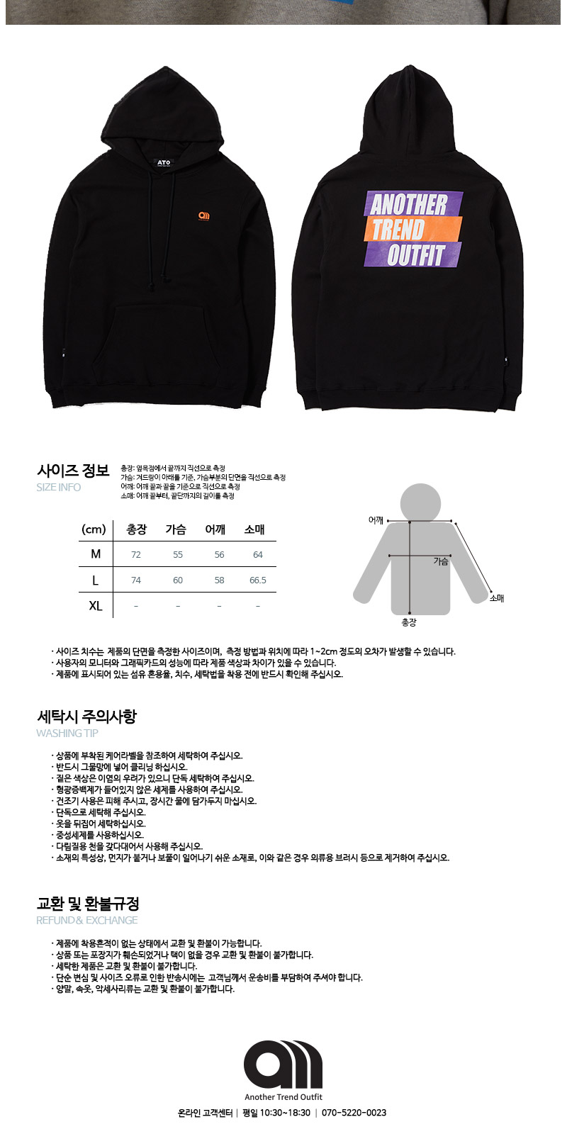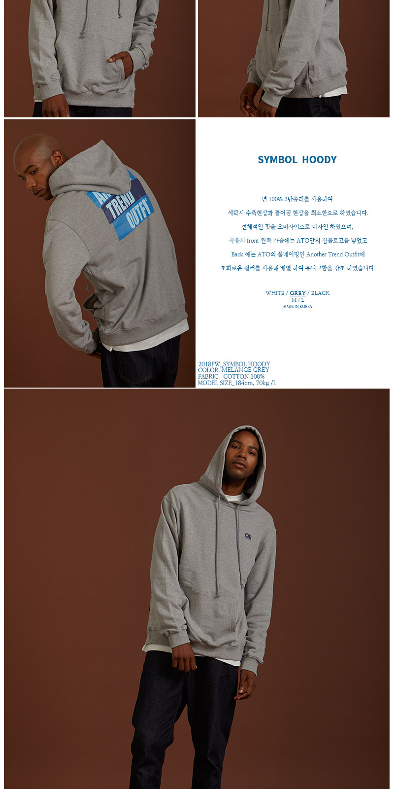 전체적인 핏을 오버사이즈로 디자인 하였으며, 착용시 front 왼쪽 가슴에는 ATO만의 심볼로고를 넣었고