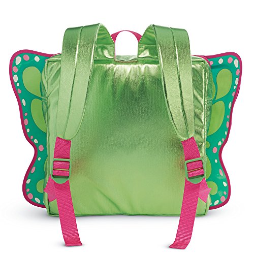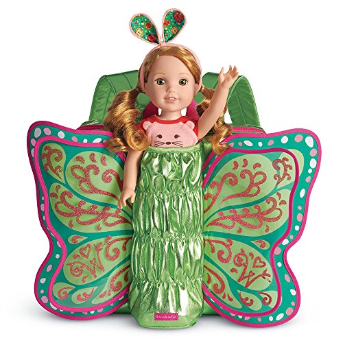 Your girl can twirl and flutter through her day with her favorite welliewishers friend in this shiny green doll carrier. It includes a backpack for books or other treasures, and has adjustable straps for comfort. The front features a pair of glittery double-layered butterfly wings with a special ruched doll pocket in between, so that both your girl and her welliewishers doll can be transformed into sparkly butterflies.Feature