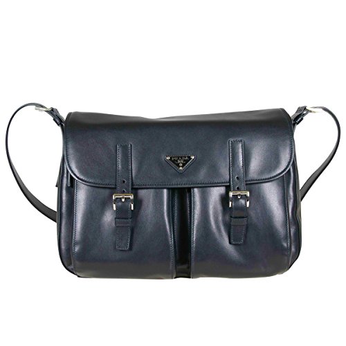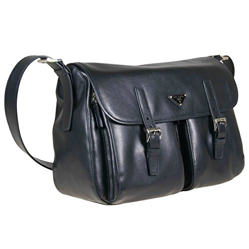 Prada Soft Calf Leather Pattina 2 Pocket Messenger Bag BT989L, Navy Blue: Authentic Prada leather Messenger Bag, made in Italy. Material: Soft calf leather in navy blue, Silver hardware. Interior: Prada logo jacquard nylon with zip pocket and open pocket. Large size - Dimensions: 14 x 7 x 11 inches (lwh) with adjustable strap drop. Two buckle closure pockets on front. Leather strap.