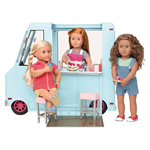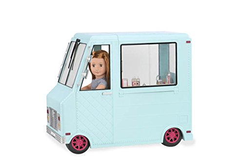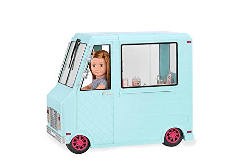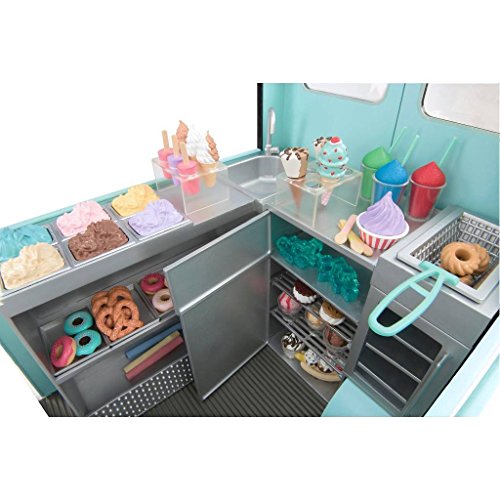 Sweet treats on wheels, all year round. Includes: 1 truck (with 3xAA batteries), 2 stools, 4 pieces of chalk, 1 customer bell, 1 napkin holder, 6 paper bills, 3 coins, 2 ice cream holders, 1 popsicle holder, 3 containers, 3 drinking cups, 3 ice cream cups with syrup, 4 serving spoons, 1 ice cream scooper, 1 jar of straws, 1 prong, 3 syrup bottles, 1 colored sprinkle shaker, 1 chocolate sprinkle shaker, 6 cones, 2 cones with nut toppings, 3 slushies', 3 doughnut trays, 2 swirl popsicles, 2 ice cream sandwiches, 3 pretzels, 6 trays with ice cream, 6 round popsicles, 3 cruller doughnuts, 1 ice cream in waffle cone, 1 soft ice cream in cup, 3 soft ice cream cones, 2 chocolate dipped popsicles, 2 dipped popsicles with nuts, 3 double popsicles, 2 clusters of ice, 2 milkshakes, 2 flavored ice cream cones with 2 paper cups, 1 large sundae, 6 doughnuts, 3 sundaes in a cup, 15 popsicles, 4 serving trays, 2 fridge racks and 1 deep fryer basket.Feature