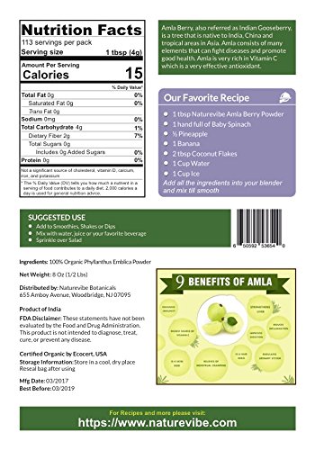 -. Feature : USDA Organic Amla Berry Powder is high in fibre, water content, and has anti-inflammatory properties. / Richest Source of Vitamin C, Nourishes the scalp and roots and promotes the growth of long and healthy hair, Increases Energy level and keep you healthy. / Pure Amla contains other potent antioxidants that can help restore energy, digestive health, vitality, flush toxins and rejuvenate your system. / Known as Indian Gooseberries used in ancient Ayurveda practice is a powerful source of antioxidants, phenols, and bioflavonoids, Promotes proper digestion. / Non-GMO, Raw, Gluten-Free, Kosher, Vegan. Great skin treatment, Improves the immune system of the body, Can be used for facials.