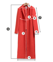 | 尺码 | ①前衣长 | ②后中长 | ③胸围 | ④前摆围 | ⑤后摆围 | ⑥肩宽 | ⑦袖长 | ⑧袖臂围 | ⑨袖口围 | ||