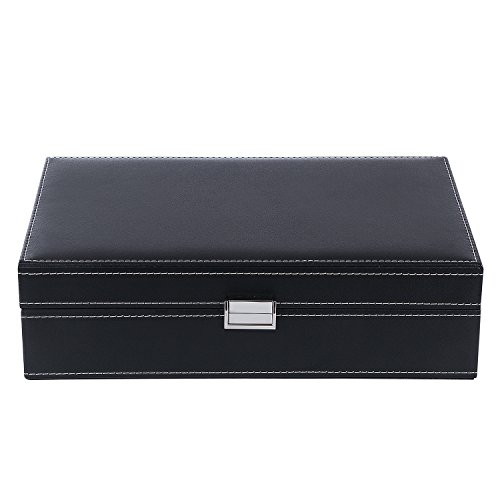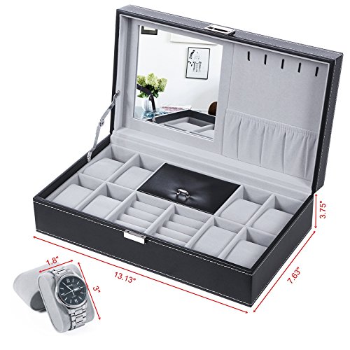 Studio : BEWISHOME Publisher : BEWISHOME Binding : Kitchen Product Description This BEWISHOME two-in-one jewelry box with 8 slots watch organizer allows you to keep all yours watch and jewelry away from dust, fingerprints, scratches and thieves. Beautiful and elegant, it makes your jewelry easier to find. Makes for the perfect gift for watch collectors for Valentine's day, Christmas, New Year, Birthday, wedding and so on. Specifications: - Materials: Black PU leather, Medium Density Fiberboard (MDF) and Grey Velvet - Color: Black Jewelry Box, Grey Pillows - Product Dimensions (W x D x H): 13.13"L x 7.63"W x 3.75"H (33.3 x 19.3 x 9.5 cm) - Watch Slot Size: 3.42" x 1.89"(8.7 x 4.8 cm) - Mirror Size: 5.51" X 5.7" (14 X 14.5 cm) - Pillow Size: 3" x 1.8"(7.6 x 4.57 cm) - Net Weight: 3.2lbs Package Contents: - 1 x Jewelry Box - 8 x Removable Pillows 100% SATISFACTORY SERVICE WARRANTY: We promise to offer 100% satisfaction to our customer. If you are not satisfied with your purchase for any reason, please kindly contact us, we will solve the problem till you are satisfied. We will either replace it or refund your money, your choice! 0
