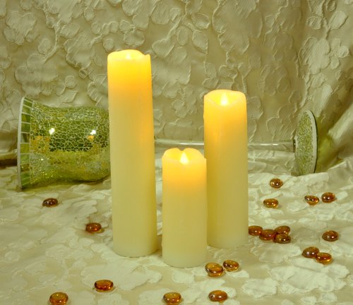 - Feature : Set of 3 ivory colored Everlasting Glow Flameless Candles / Wax pillar candles with wavy, melted-edges and drip look / Candles are all 2-inches diameter; one is 5-inches tall, one is 7-inches, and one is 9-inches / Batteries are included / Flame free, smoke free, and worry free candles let you enjoy the ambiance of candlelight safely
