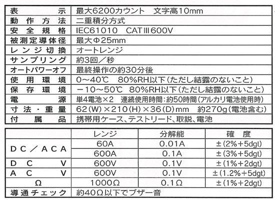| 付属品 | 携帯用ケース、テストリード、電池(単4)×2、取扱説明書、保証書(保証期間1年) |