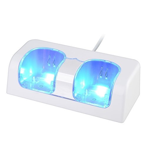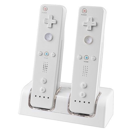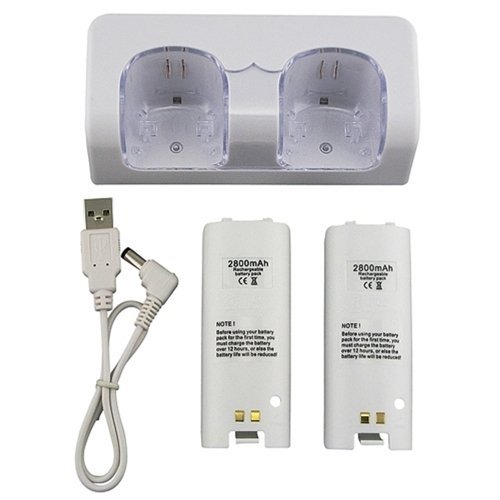 - Feature : Use this charging station to charge up to two (2) Wii controllers at a time. Light shines red when charging and blue once charged. / Package contents include: 1 x dual charging station, 2 x 2800mAh battery packs, 1 x USB Plug / Indicator Lights: Red=Charging; Blue=Fully Charged / Color: White / Note: Not manufactured by Nintendo