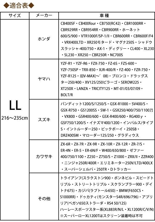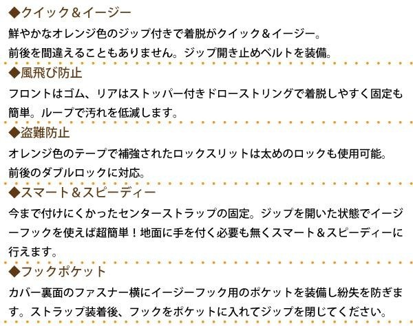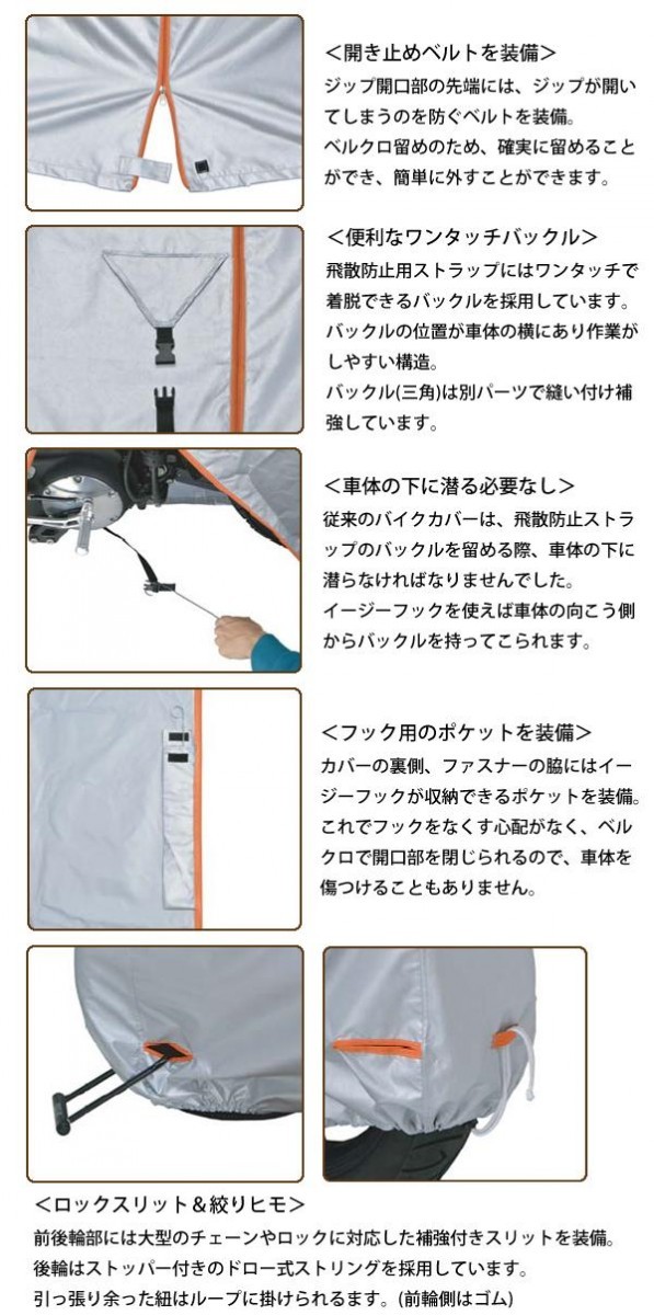 | 大切な愛車を埃や水滴、紫外線から守ってくれるバイクカバー!このカバーは数々のアイデアを盛り込んで、簡単に着脱できるよう工夫されています。車体左側側面の中央部にある大きなジップは、カバー側面の半分ほど開きます。開いたカバーの両端を持って車体にかぶせることで、ミラーやハンドルバーなど、従来カバーをかぶせる際に引っかかっていた部分もすんなりと覆うことができ、前後を間違うこともありません。 |