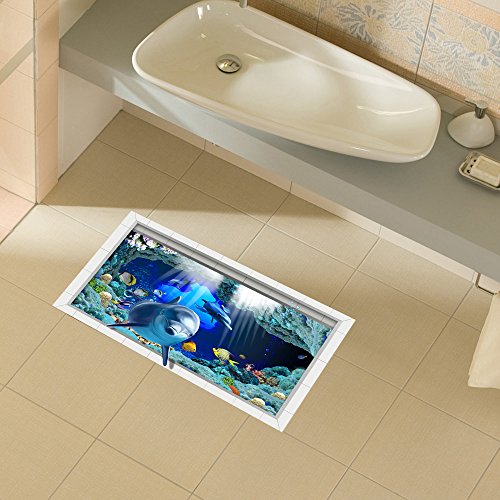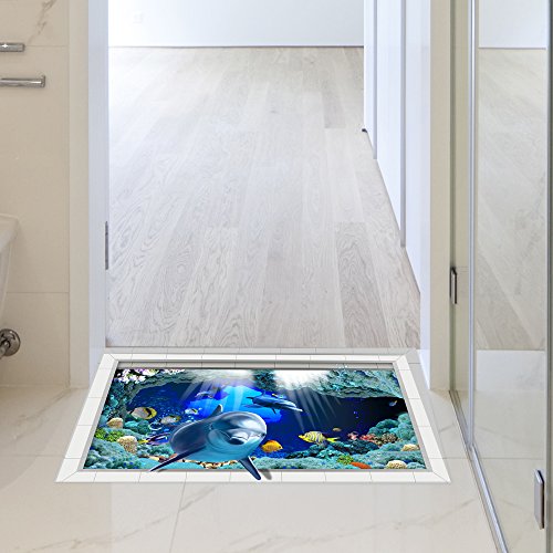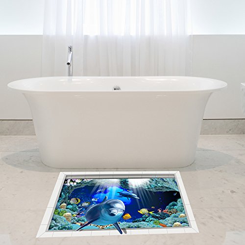 H4S Dolphins Fishes in Blue Ocean 3D Peel and Stick Waterproof Non Slip Thin PVC Bathroom Floor Stickers Shower Bath Mats Rugs Stickers Door Mat Sticker Art Decor Wall Decals for Kids, 22.83" X 35.43"