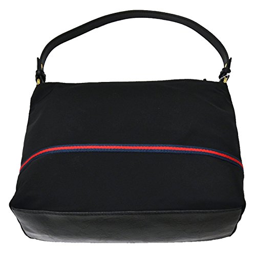Tommy Hilfiger knows fashion! This small hobo purse measures 11.5" (L) x 9.5" (H) x 4.5" (D) with a 7.5" strap drop. It features a smooth solid colorblock material and imitation leather. This purse has a full-length top-zipper, an interior zip close pocket, and an interior pouch. Metallic hardware adds a subtle touch to this unique design.Feature