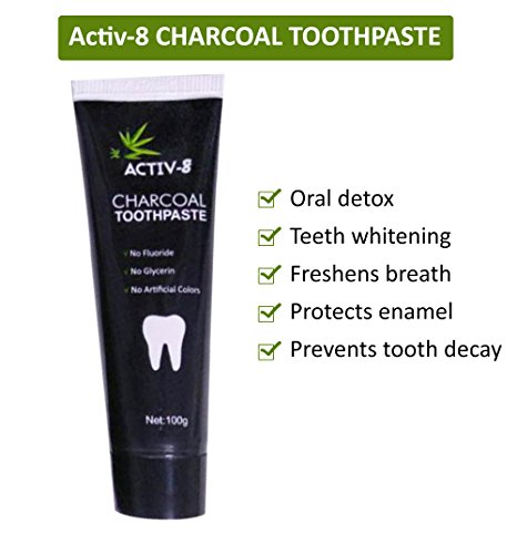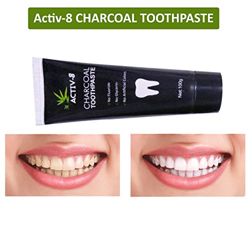 Activ-8 toothpaste kit is the perfect teeth whitening package. The kit contains Grade A charcoal toothpaste and a top grade bamboo toothbrush. This Activated Charcoal Teeth Whitening toothpaste made with natural organic bamboo charcoal destroys bad breath and removes smoke stains and Coffee stains.This product unites modern science and nature and is manufactured from eco-friendly materials without harmful effervescent or abrasive ingredients. Directions For Usage: Use a pea sized amount of Activated Charcoal Toothpaste and brush normally. Use after every meal, twice daily or as directed by a physician or dentist. 0