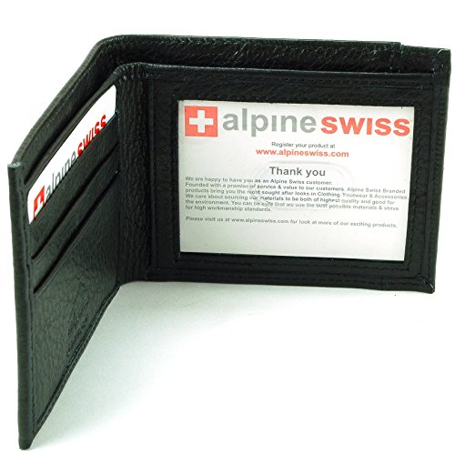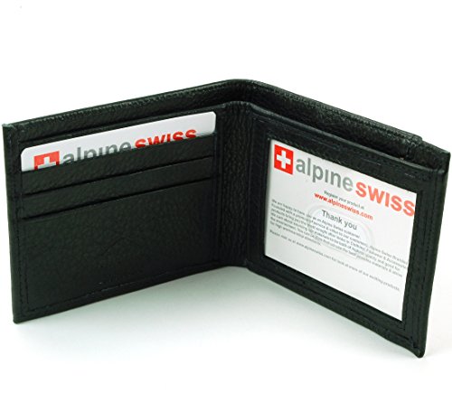 Slimfold Wallet By Alpine SwissOne of the main features is its EZ access outer pocket slot which will allow you to not have to flash the rest of your wallet contents to get something out of it, you may place a card or billfold in this outer pocket.    Product Features:Measures: 4.12" x 3.25" x 0.625" No Frills all Function Bifold Alpine Swiss Cross Mark outside3 Inside Card Slots 1 Oversized Inside Card/Receipt PocketEZ Access Outer Oversized Slot 1 ID WindowFully Lined Bill SectionMade of Top Grain Durable Leather Inside & OutThin and Slim ProfileMSRP $45.00Alpine Swiss donates 250 meals every day to hungry children in the U.S. and around the world through our partnership with Children’s Hunger Fund. These meals are hand delivered in a Food Pack, which will contain enough food to feed a family of 4-5 for a week to the homes of the needy by trained volunteers in their community, establishing relationships that foster genuine care. Your purchase fuels this effort! Thank you!