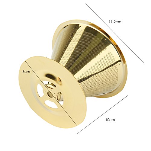 Studio : SOONHUA Publisher : SOONHUA Product Description Specifications: Fits securely over most cups Reusable micro mesh filter (no paper needed) Stainless steel 18/8 (304) food grade Lightweight, compact travel size Makes 1-2 cups of coffee Use 2 tablespoons of coffee ground per 6 oz. of water Dishwasher safe or hand washable Dimensions 5.2*4.5*3.4 inches Color: Gold
