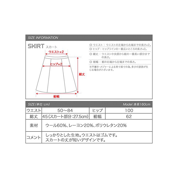 원단:울6%/레이온2%/폴리우레탄2%제대로 된 원단/웨스트는 고무/스커트의 키는 짧은 디자인입니다