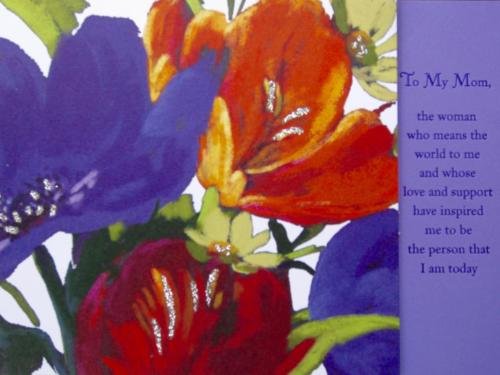 Features an illustration of a Nel Watmore painting, with "To My Mom, the woman who measn the world to me and whose love and support have inspired me to be the person that I am today" printed in purple foil, embellished with glitter.