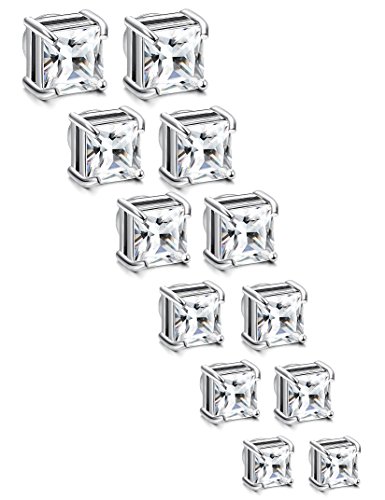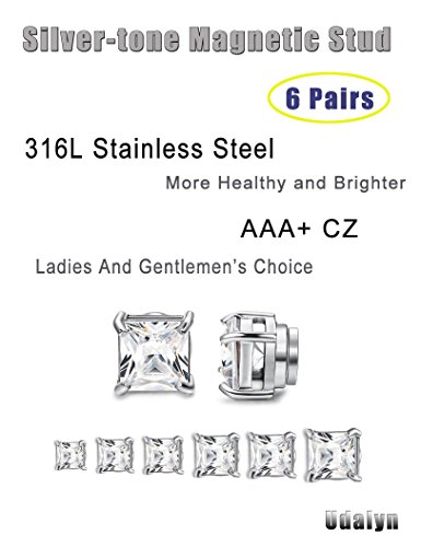 Udalyn 6 Pairs Stainless Steel Magnetic Earrings :Square Cubic Zirconia Magnetic Stud Earrings Set, Simple And Stylish, Elegant For Female, Gentle For Male; AAA+ CZ And High Quality Stainless Steel, With Stronger Magnet, Made The Set More Noble
