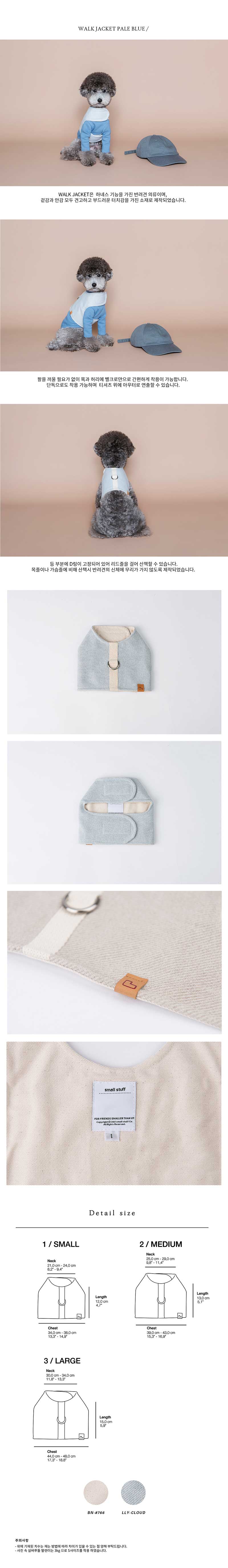 | WALK JACKET은 하네스 기능을 가진 반려견 의류이며, 겉감과 안감 모두 견고하고 부드러운 터치감을 가진 소재로 제작되었습니다. 팔을 끼울 필요가 없이 목과 허리에 벨크로만으로 간편하게 착용이 가능합니다. 단독으로도 착용 가능하며 티셔츠 위에 아우터로 연출할 수 있습니다. 등 부분에 D링이 고정되어 있어 리드줄을 걸어 산책할 수 있습니다. 목줄이나 가슴줄에 비해 산책시 반려견의 신체에 무리가 가지 않도록 제작되었습니다. 사진 속 실버푸들 발렌이는 3kg으로 S사이즈를 착용하였습니다. |
