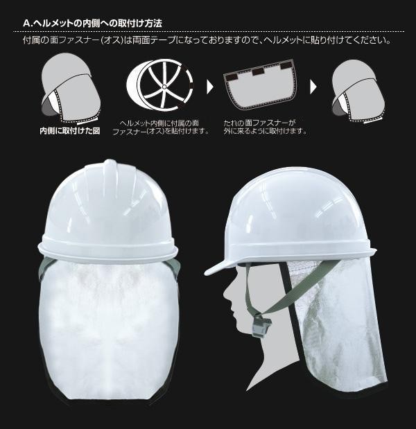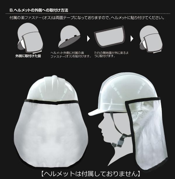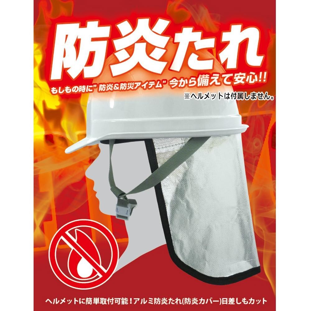 | 面ファスナー3ヵ所止めでヘルメットに簡単に装着可能な防炎たれです。日差しもブロックできるので熱中症対策にも最適です。折りたたんでポケットに入れておくこともできるので、いざという時のために常備しやすいです!! |