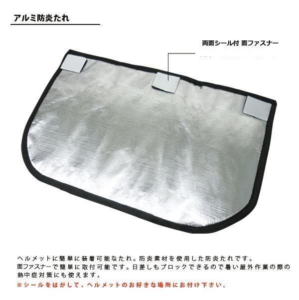 面ファスナー3ヵ所止めでヘルメットに簡単に装着可能な防炎たれです。日差しもブロックできるので熱中症対策にも最適です。折りたたんでポケットに入れておくこともできるので、いざという時のために常備しやすいです!! |