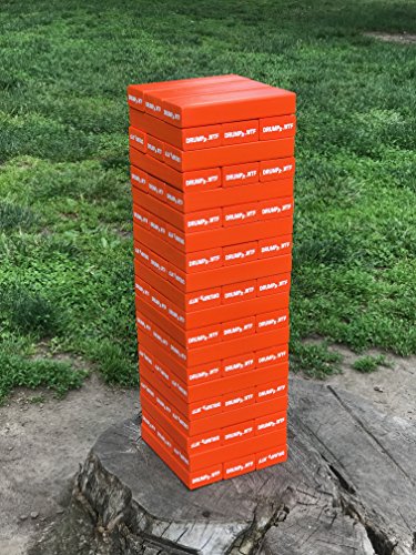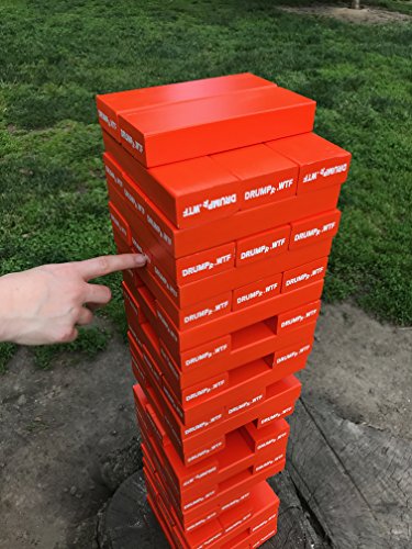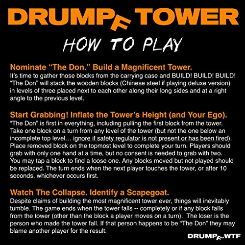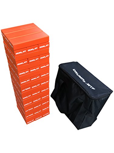Studio : Drumpf.WTF Publisher : Drumpf.WTF Binding : Toy Product Description BUILD! BUILD! BUILD! You've made some pretty big claims and now need to build the most spectacular tower anyone has ever seen. Gather some of your most questionable friends and START GRABBING! Stack those blocks as high as you can until the whole thing inevitably comes tumbling down. Drumpf Tower contains 60 pine blocks painted in a beautiful enamel skin tone orange color. Each block measures approximately 7" x 2.25" x 1.25" with a combined height approaching 5' in gameplay. A zippered bag is included to help you transport and store your game. NOTE: This tower is not like the handmade games with 11" blocks seen in bars and other venues. Those games are made from soft pine 2" x 4"s that do not provide the playability, durability, and safety of our authentic Drumpf Tower game. 0