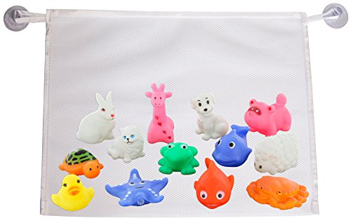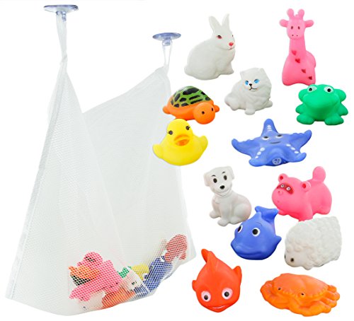 A set of 12 bath toys and toy organizer net bag. Farm and sea animals that squeak and squirt. Large white nylon net toy organizer with 2 suction cups. Bath time is more fun for babies, toddlers and children. Click "Add to Cart" and Get Bath Toys Organizer Delivered To Your Door In 2 Days! 0 |