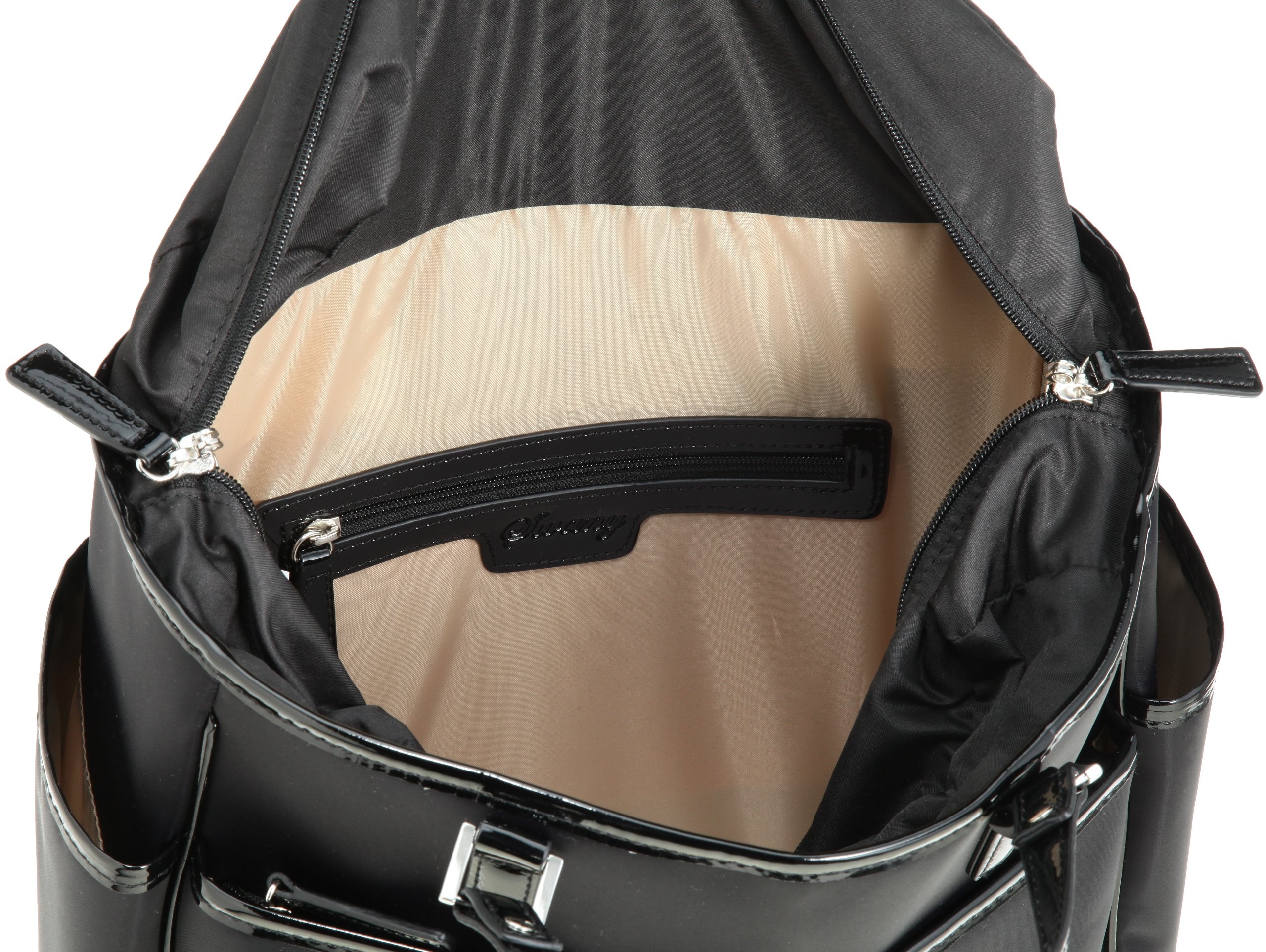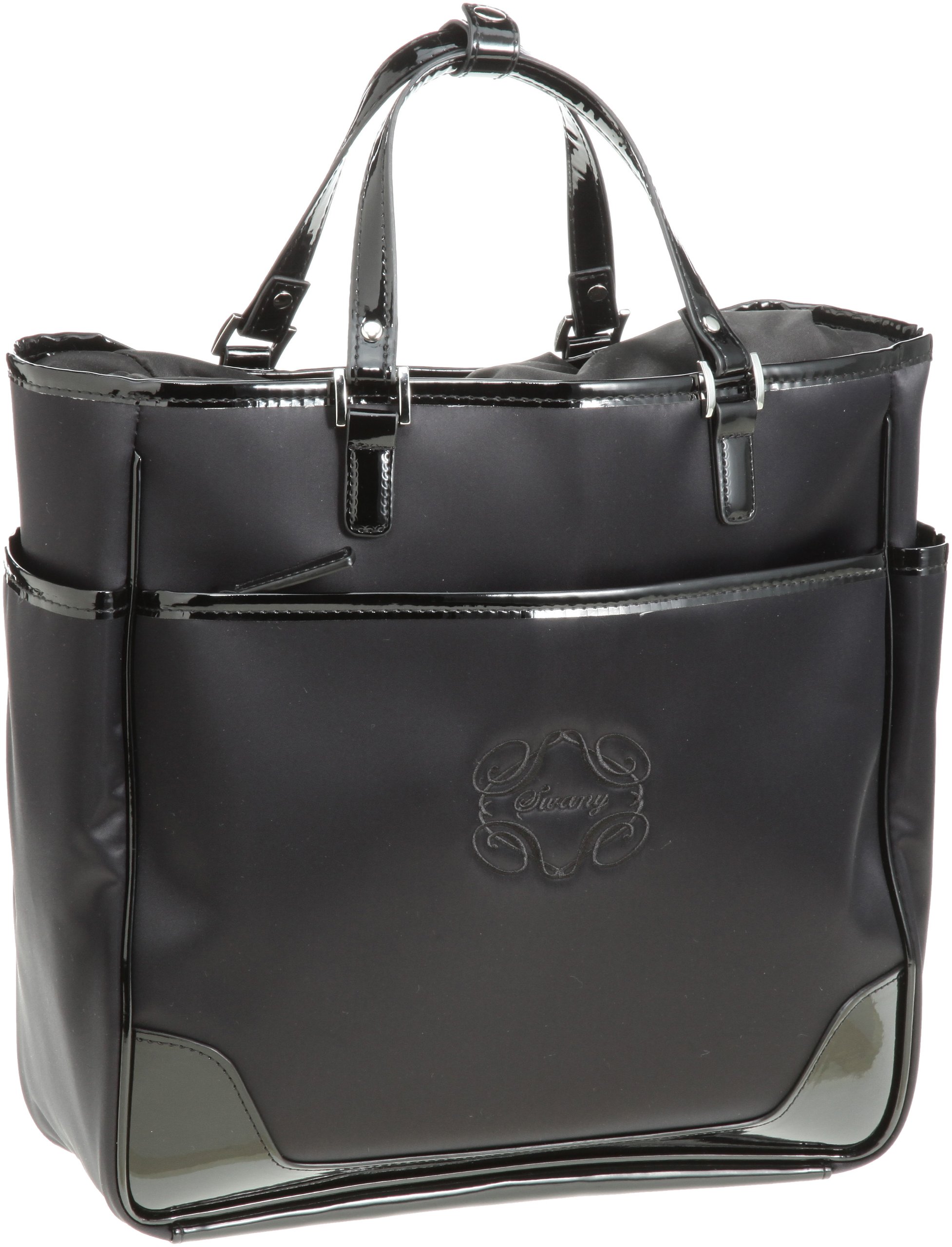 It is an elegant walking bag with enamel material attached, and monogram embroidery on the center.