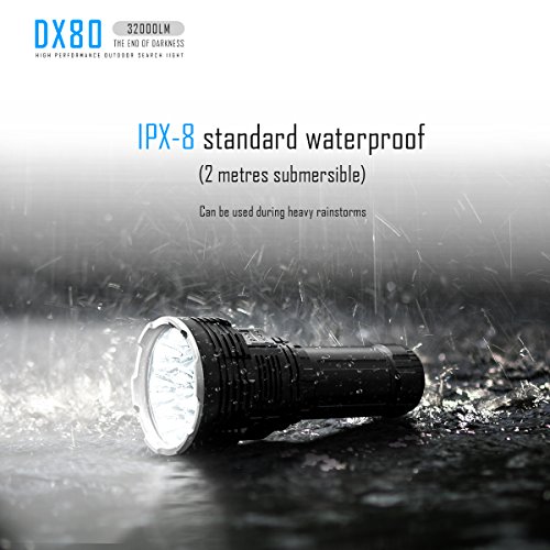 - Six output levels + Strobe(Turbo mode:32000lumens, General mode:13000lm,5000lm,1500lm,500lm and 120lm); no matter the terrain, no matter the environment, your DX80 will respond to just about anyway you'd like it to.