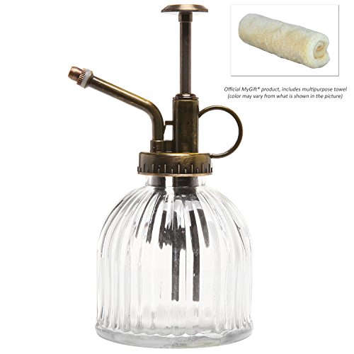 - Feature : Plant mister featuring a glass bottle and a plastic top pump. / Ideal for watering small plants inside your home and office. / The easy-to-use thumb pump and the ring-finger holder makes misting your plants easy and convenient. / **Official MyGift® product includes multipurpose cleaning towel.** / Approximate Dimensions: 3.5