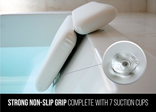 7 SUCTION CUPS: Seven powerful suction cups uniquely help eliminate common and irritating pillow slippage to create the most relaxing bathing experience.