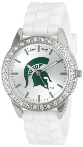 -. Binding : Watch -. Brand : Game Time -. Color : Michigan State University -. Department : womens -. EAN : 0846043099829 -. Feature : Solid white, soft, pliable and durable silicone strap with a solid stainless steel buckle closure / Solid silver-tone, alloy metal case with solid stainless steel case back and crown / Durable mineral crystal protects watch from scratches; all with a limited lifetime warranty / Water-resistant to 30 M (99 feet) -. IsAutographed : 0 -. IsMemorabilia : 0 -. Label : Game Time -. Manufacturer : Game Time -. Model : COL-FRO-MSU -. MPN : COL-FRO-MSU -. NumberOfItems : 1 -. PackageQuantity : 1 -. PartNumber : COL-FRO-MSU -. ProductGroup : Watch -. ProductTypeName : WATCH -. Publisher : Game Time -. ReleaseDate : 2013-11-12 -. Size : NO SIZE -. Studio : Game Time -. Title : Game Time Women's COL-FRO-MSU "Frost" Watch - Michigan State -. UPC : 846043099829