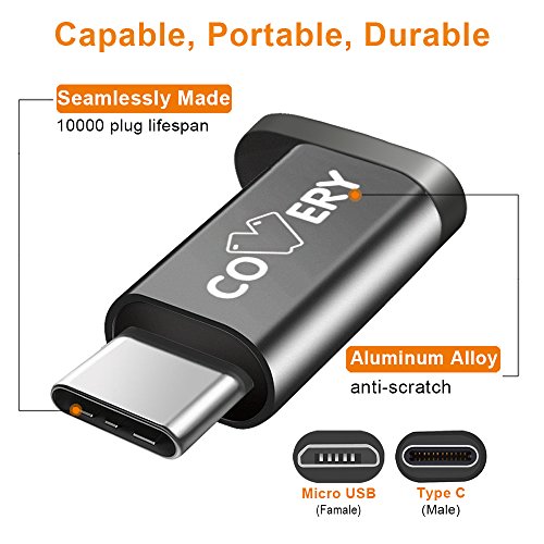 Studio : Covery Publisher : Covery Binding : Electronics Product Description Production Description Color: 2 pack sliver2 pack black Interface: Micro USB (Female),USB-C (Male) Key Features: 1.Reversible Design: (plugs in both ways) allows you to connect the adapter into the USB-C devices in any orientation for maximum convenience. 2.Charge Sync: Uses USB 2.0 protocol for high-speed Micro USB charging and fast data transfer (480 Mbps). Has a 56KΩ pull-up resistor for incredible safety and reliability. 3.Material: Premium Aluminum housing cover adds premium durability to the cable. 4.Compatible Devices Include: Samsung Galaxy S8(2017), Samsung Galaxy S8 Plus/S8 , LG G6,G5,V20, LG Nexus 5X , Huawei P9 Plus, Huawei P9, Huawei Mate 9, Google Nexus 5X ,Nexus 6P, Google Pixel, Google Chromebook Pixel, Lumia 950, Lumia 950XL, OnePlus 2,3,3T, ZTE Axon 7, Moto Z2 play, HTC 10, Nokia N1, Asus Zen AiO, Lenovo Zuk Z1, Nintendo Switch, 2015 Apple new MacBook with 12" Retina Display and other usb type c cable device. What You Get: 4x Covery Micro USB to USB-C Adapter, (2pack sliver2pack black) Warranty:For 18 months after the date of purchase, we take care of all quality-related issues with a REPLACEMENT or REFUND. Pls contact our COVERY support team at the first time if you got the defective item. 0