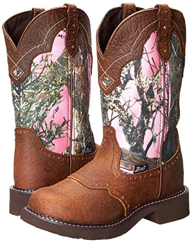 Show off your fun cowgirl style in a pair of Gypsy boots by Justin These fashionable western boots are made of genuine leather with saddle overlay, pink camo shaft, and diamond-cut accents on the pull tabs. Justin has been handcrafting boots for cowboys since 1879. Their attention to detail, skill, and passion for boots is what brings cowboys and cowgirls back time and time again. The moment you pull on a pair of Justin boots, you'll get it. It's part of our western heritage and no one is more proud and humbled by this than Justin.Feature