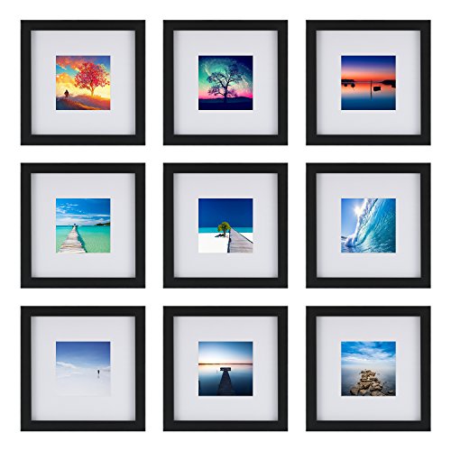 9pcs Picture Frames 8x8 inchesPackage includes:9 x black wood frames, 9 x mats, 9 x printed photo, protective packing, wall mounting material