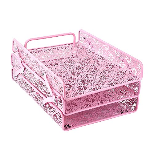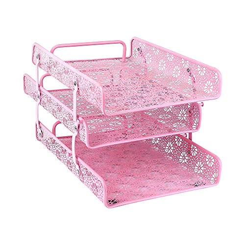 Crystallove Metal Hollow 3-Tier Document Tray Files Sorter Paper Holder Magazine Frame of Desk Accessories Office Supplies Organizer (Pink)