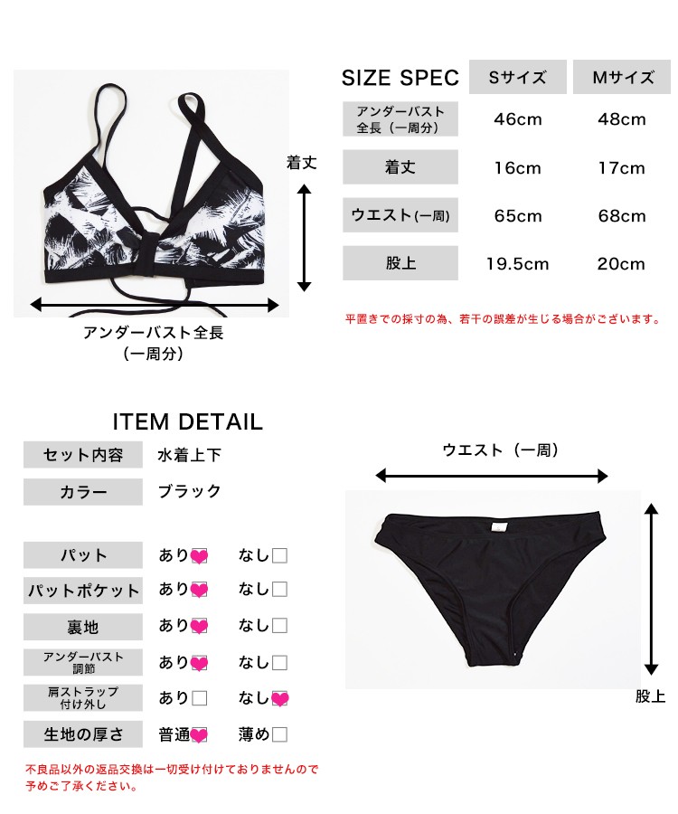 | サイズ | [S] アンダーバスト全長(一周分):46cm 着丈:16cm ウエスト(一周):65cm 股上:19.5cm [M] アンダーバスト全長(一周分):48cm 着丈:17cm ウエスト(一周):68cm 股上:20cm |