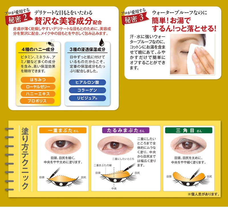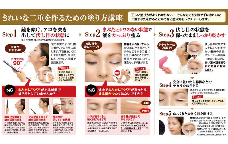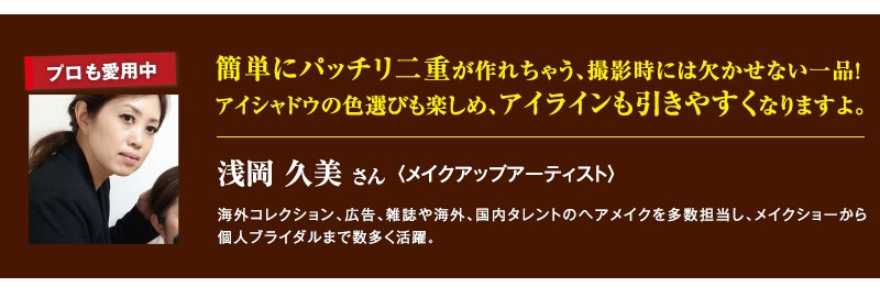 | ご使用方法 | 商品パッケージに同封されている【使用説明書】を、ご使用前に必ずお読みください。 ◆アイリッドボーテは、皮膚にのせると乾いて半透明のテープ状に変化します。目を閉じても違和感のない、自然な二重まぶたを形成します。 |