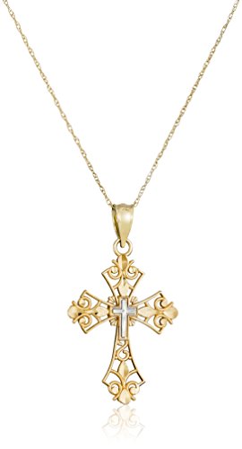 -. Feature : Yellow gold necklace featuring ornate filigree cross pendant with mini silver-tone cross at center / SP.R.Ing-ring clasp / Imported