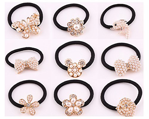Lovef 2015 New 9 Pcs Beautiful Full Pearl with Crystal Rhinstone Flower Five Leaves Flower Bow Fish Butterfly Design for Baby Kids Children Girl Women Hair Accessories Elastic Tie Ponytail Holders Princess Baby Hair Rope Rubber Bands Accessories