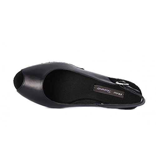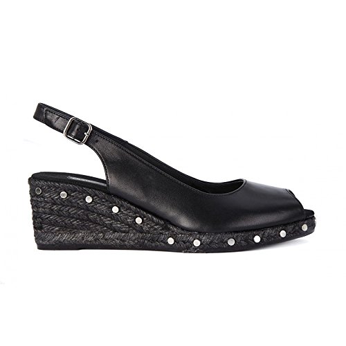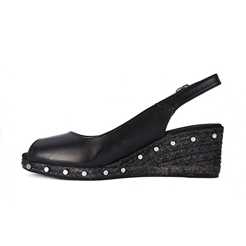 Product DescriptionBlack leather woman's sandal with adjustable buckle closure, lining and insole textile, bi-material sole natural rope and rubber.0
