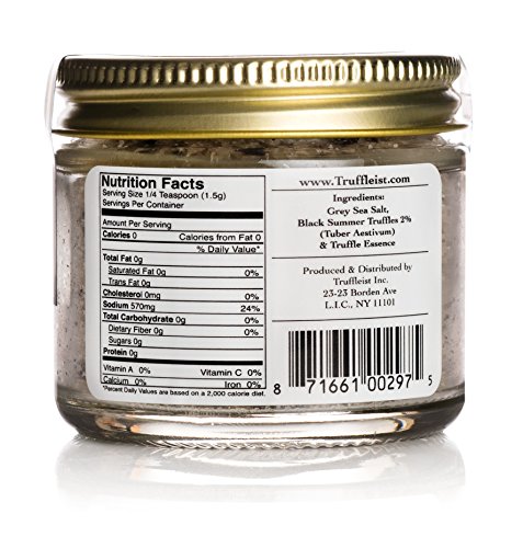Ingredients: Sicilian sea salt (unrefined, hand harvested), black summer truffles (2%), truffle essence