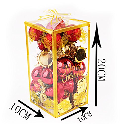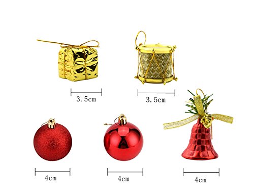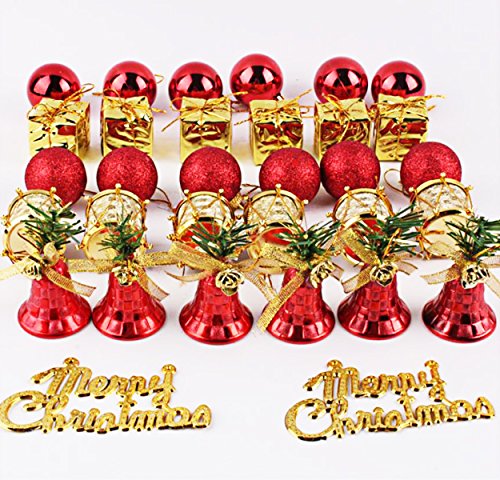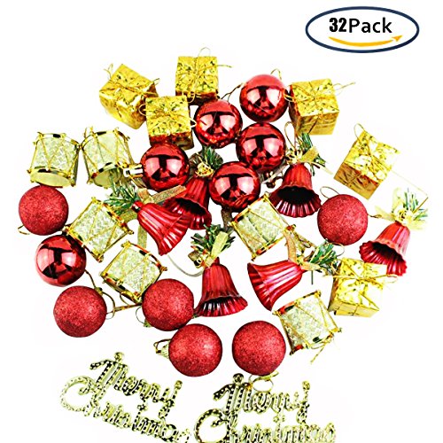 6 different kinds of 32ct Christmas ornaments in one barrel, including Christmas balls shiny/glittery, presents, bells, drums and Merry Christmas letters.
