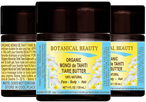 -. Feature : One of the most extraordinary butters for skin and hair care with Tiare flowers infusion. A Little Goes a Long Way, Absorbs Quickly, Not Greasy, Unscented, Chemical Free, Not tested on Animals, Does not contain any preservatives. / MONOI de TAHITI TIARE BUTTER ORGANIC is an extraordinary butter for skin and hair care. It penetrates and hydrates the skin rapidly and reduces trans-epidermal water loss. MONOI de TAHITI TIARE BUTTER helps to heal dry, chapped and cracked skin, balances the moisture in skin, reducing the appearance of wrinkles and leaving skin soft and smooth. MONOI TIARE TAHITI BUTTER is suitable for all skin types, especially for dry or mature aging skin. / MONOI de TAHITI TIARE BUTTER ORGANIC exhibits good spread-ability on the skin, making it ideal as a massage butter or body balm, and it can be added to soaps, creams, lotions, body butters, and more. / MONOI de TAHITI TIARE BUTTER ORGANIC helps damaged skin like burns, wounds, cuts, scars, itchy, scaly, irritated skin conditions such as eczema and psoriasis. Also use it on areas that need extra attention like the elbows and knees. / MONOI TIARE TAHITI BUTTER ORGANIC helps for DAMAGED HAIR, DRY SCALP AND BRITTLE NAILS. MONOI de TAHITI TIARE BUTTER promotes silky soft hair, prevents moisture loss and adds elasticity and suppleness, and also provides an immediate sparkle and shine, and helps to mend split ends.