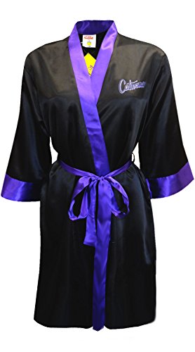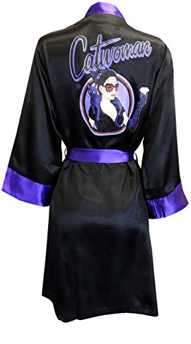 Studio : Underboss Publisher : Underboss Binding : Apparel Product Description For the unstoppable woman! These gorgeous satin robes for women have the DC Comics Bombshell version of Catwoman on the rear for an updated look. Collar and cuffs really stand out in bold purple contrast to the black robe. Purple contrast on the belt and an interior tie make this robe just wonderful! Length hits mid thigh, 3/4 sleeve. 0