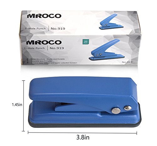 MROCO 1-Hole Punch,1/4" Holes, Hole Puncher, Reduced Effort Paper Punch, 20 Sheets Capacity, with Skid-resistant Base for PVC ID Card, Paper, Chipboard, Leather, Plastic, and Fabric (Blue)