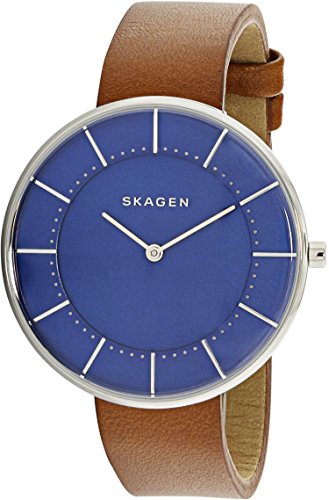 Watch Sizing Guide Carry your look with an edgy confidence with this sleek Skagen® watch! Stainless steel case. Leather strap with adjustable closure. Round face. Three-hand analog display with quartz movement. Blue dial features silver-tone hands and hour markers, minute track, and Skagen detailing. Water resistant 3 ATM. Display box included. Imported. Measurements: Case Height: 39 mm Case Width: 39 mm Case Depth: 8 mm Band Width: 16 in Band Circumference/Length: 7 3⁄4 in Weight: 1 oz This product may have a manufacturer's warranty. Please visit the manufacturer's website or contact us at warranty@support.zappos.com for full manufacturer warranty details.Feature