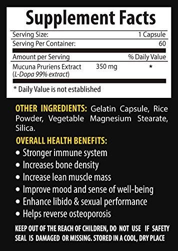 Studio : Skin Care Solution Publisher : Skin Care Solution Binding : Health and Beauty Product Description libido lift for men - L-DOPA 350MG - MUCUNA PRURIENS EXTRACT - macuna el dopa - 3 Bottles (180 Capsules) LIFT YOUR MOOD: For someone experiencing lowered dopamine levels due to stimulant use and the stresses of modern life, the benefits of taking mucuna may include a significantly positive effect on their mood. It is, in fact, often described as a natural nootropic. Many people report mood enhancement and elevated alertness within an hour of taking kapikachhu powder or mucuna pruriens supplements on an empty stomach. BRAIN COGNITION PROMOTER: Research suggests Mucuna pruriens protects the brain by keeping cognitive and neural functions in check, even encouraging neural activity. Antioxidants donate an electron to the free radicals to neutralize its effects, particularly on the brain. Mucuna has an added benefit in that it fights systemic redness in the brain, which is often a factor in poor brain health conditions. INCREASE YOUR LIBIDO: Not surprisingly, fruits and seeds correlate with the reproductive system and the seeds of Mucuna pruriens are revered as one of the best diet additions for men's and women's libidos alike. Mucuna pruriens is an aphrodisiac which may bolster healthy sexual energy and libido. PROMOTES DIGESTION: Because it promotes smooth muscle contractions and ushers in a spreading quality, Mucuna pruriens can help foster healthy digestive function and promote proper elimination of waste. Mucuna pruriens is also thought to support healthy blood sugar levels. In addition, the seeds are considered to be highly nutritive, with qualities similar to other commonly consumed legumes. 0