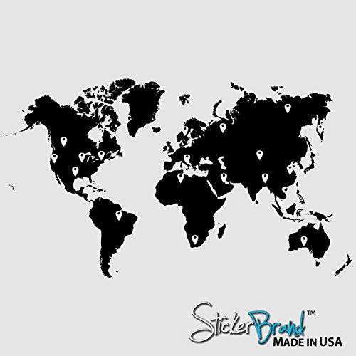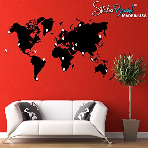Stickerbrand Vinyl Wall Art World Map of Earth with Pin Drops Wall Decal Sticker - Black Map w/ Red, Black, White & Grey pins, 40" x 70". Easy to Apply & Removable - FREE Application Squeegee