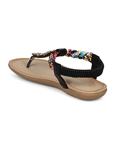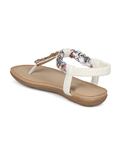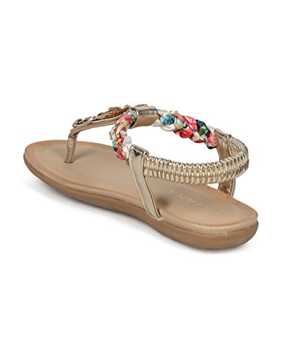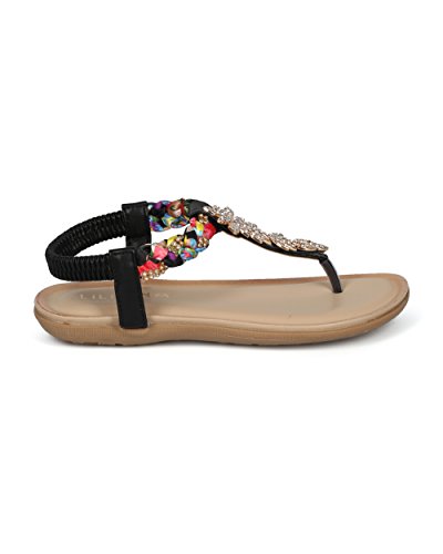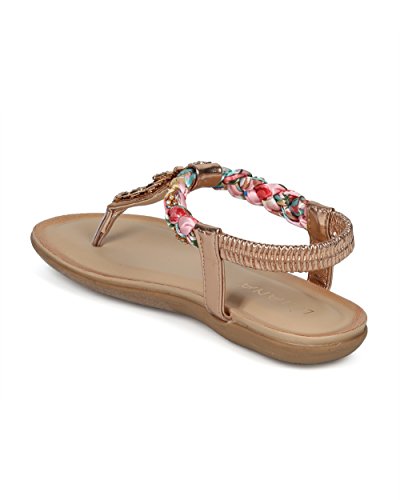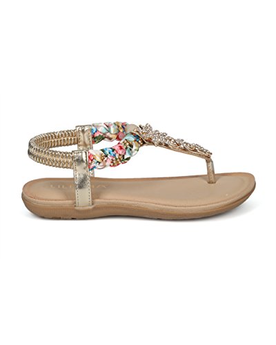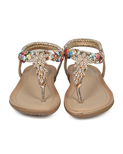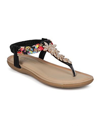 (Alrisco)/Women's/Sandals/DIRECT FROM USA/Women Braided T-Strap Rhinestone Leaves Accent Flat Sandal - HG25 by Liliana Collection